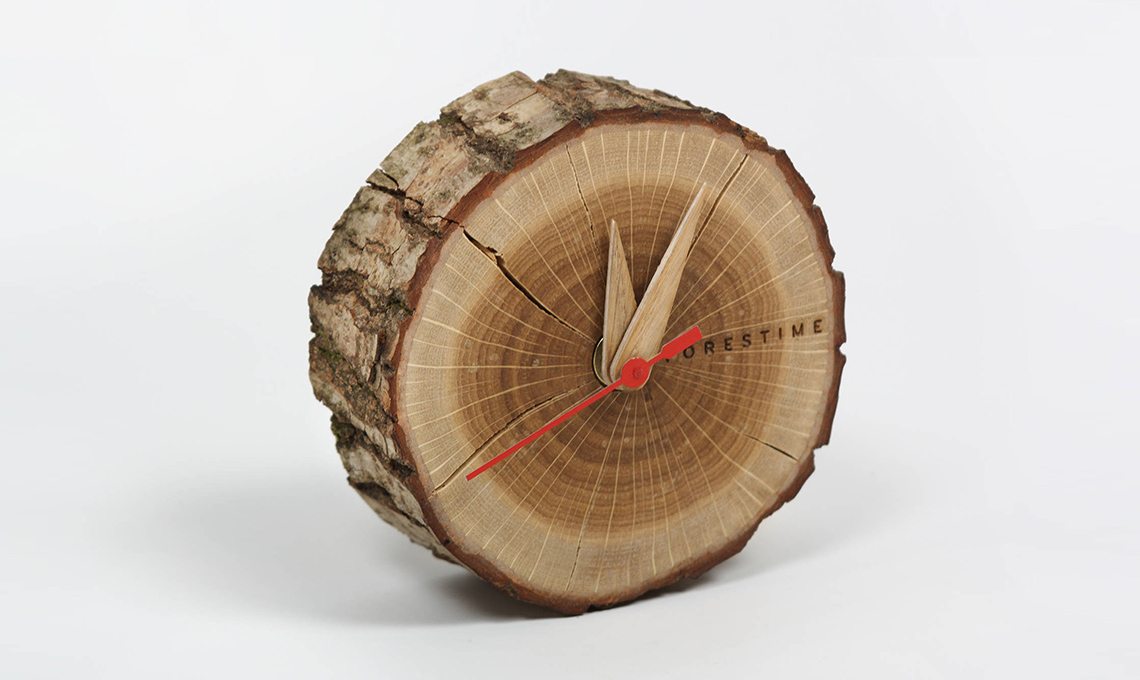 Ricavato da un tronco di quercia, Forestime è un eco-orologio da tavolo [Rio Lindo, cm Ø 9-12x6h da €33,10].