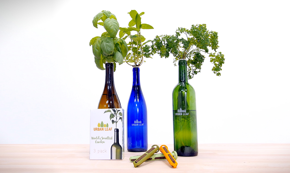 Set per piante aromatiche in bottiglia World’s Smallest Garden [Urban Leaf €18,90/3 pz].