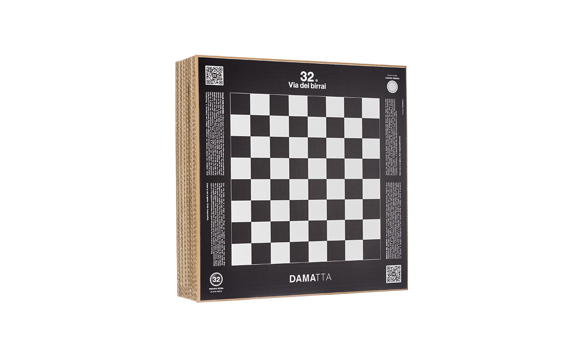 6 La scacchiera in cartone riciclato è la confezione regalo contenente 4 bottiglie di birra 32 [32 Via dei Birrai, cm 43x43x12h €103].