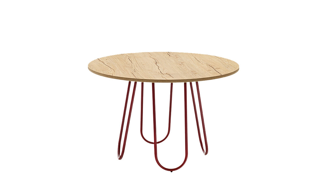 Basamento in tubolare di metallo e piano in legno nel tavolo Stulle [Connubia, ø cm 120x70h da € 662].