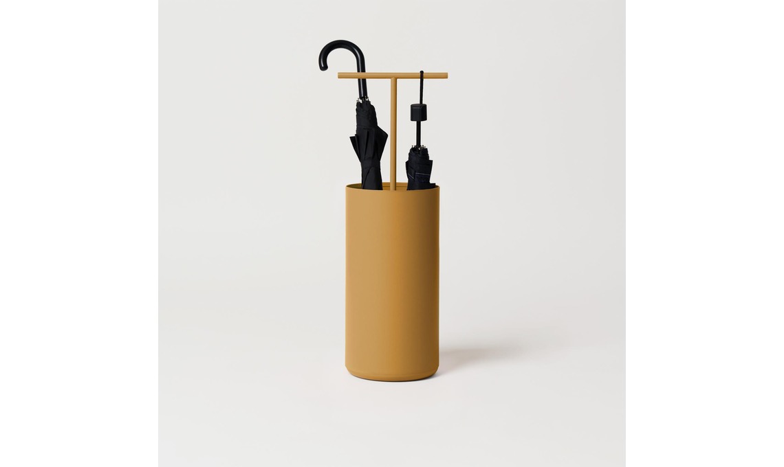 Portaombrelli Plu in metallo verniciato Cannella con manico [Hiro, ø cm 25x71h € 99].