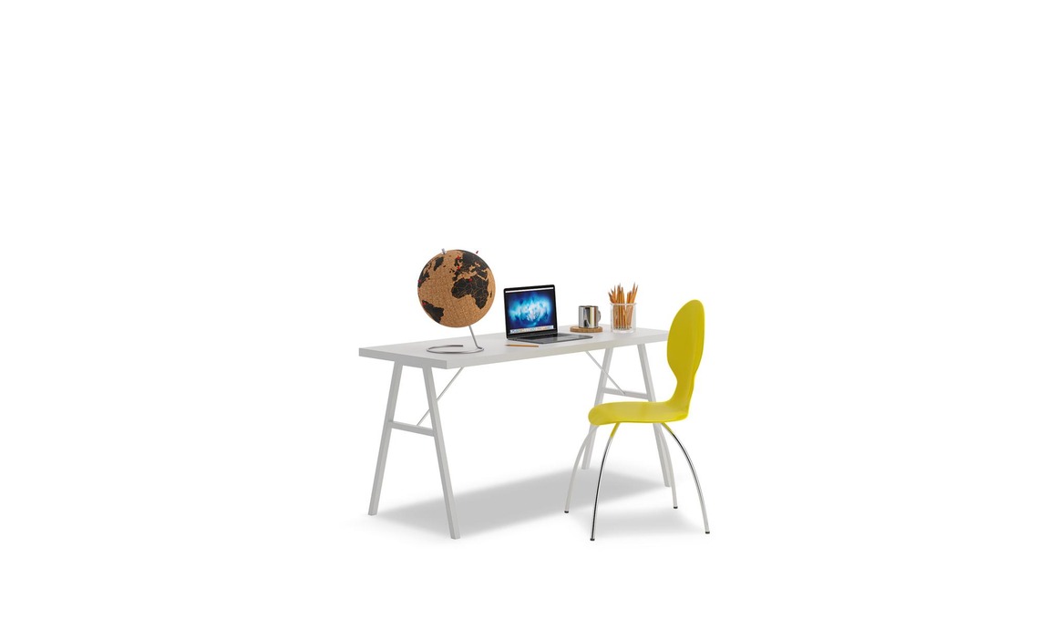 Sedia in multistrato e metallo con scrivania in metallo e nobilitato bianco [Giessegi, cm 45x50x88h € 274,50 e cm 150x58x75h € 426].