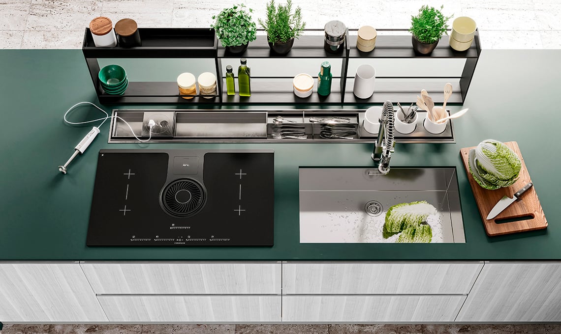 L’alzata per utensili e condimenti e la canalina con prese elettriche sono ideali sul top della zona operativa.