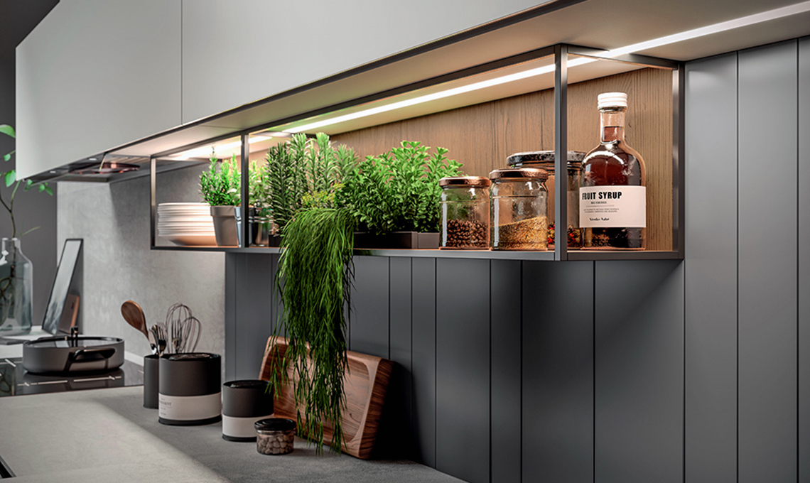 le aromatiche e le spezie sono sul ripiano con luce, accanto ai fuochi.