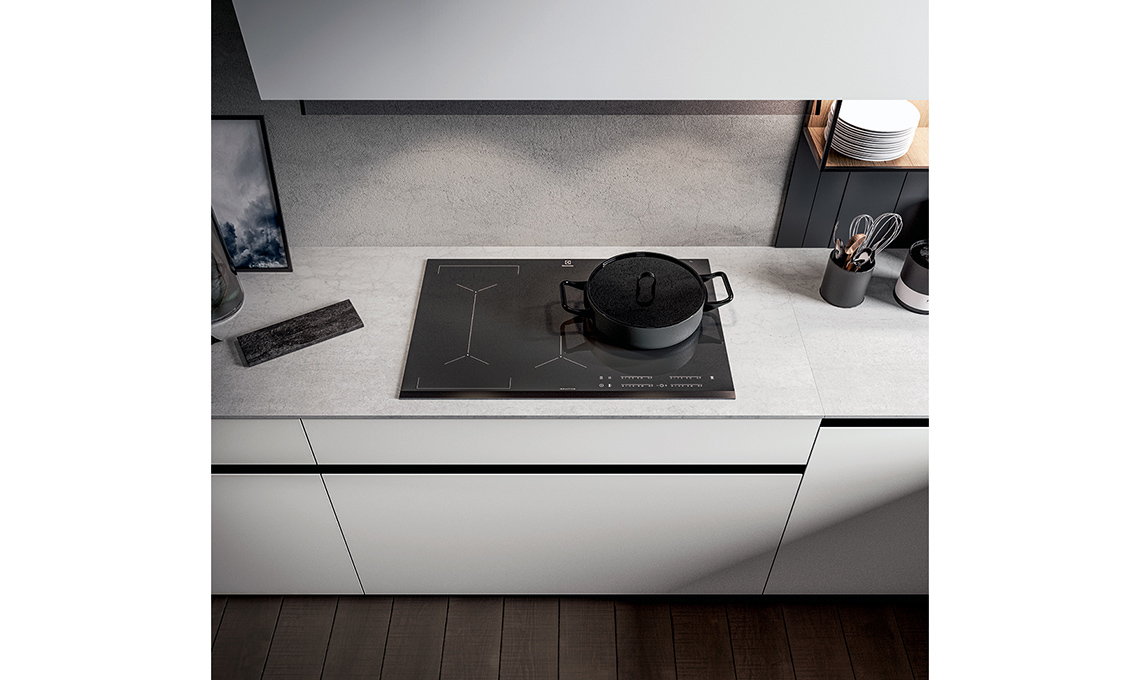 La zona lavaggio ha il maxi lavello monovasca squadrato integrato nel piano di lavoro.