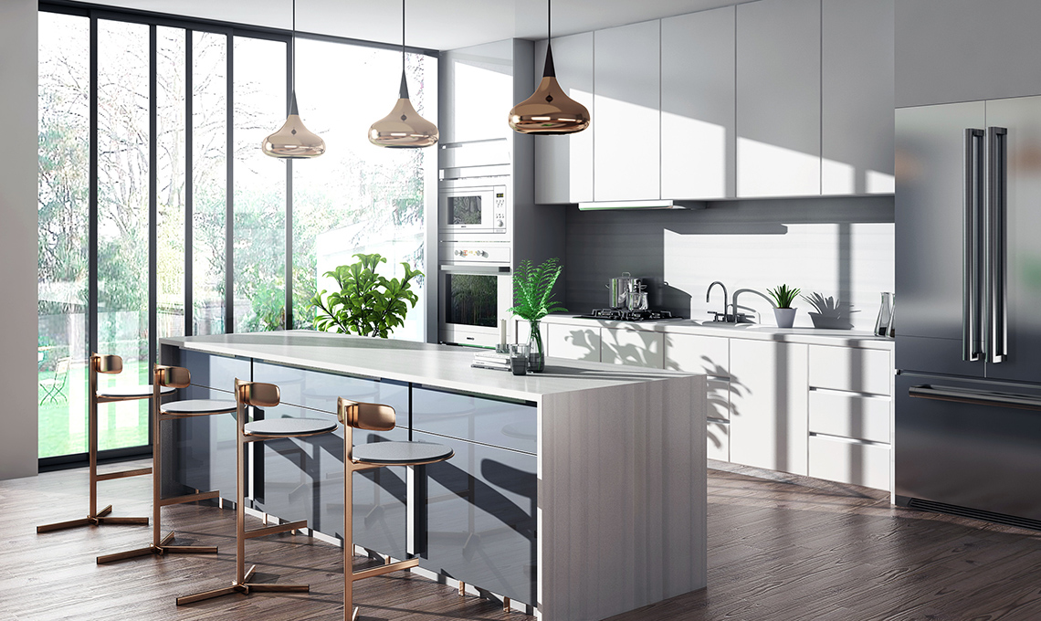 Glass 2.0 di Arredo3 in composizione ‘a golfo’, con ante in vetro opaco grigio foca per le colonne e color piuma per basi e pensili, più piano di lavoro e schienale in Laminam pietra di Savoia e banco snack in impiallacciato rovere pergamena.