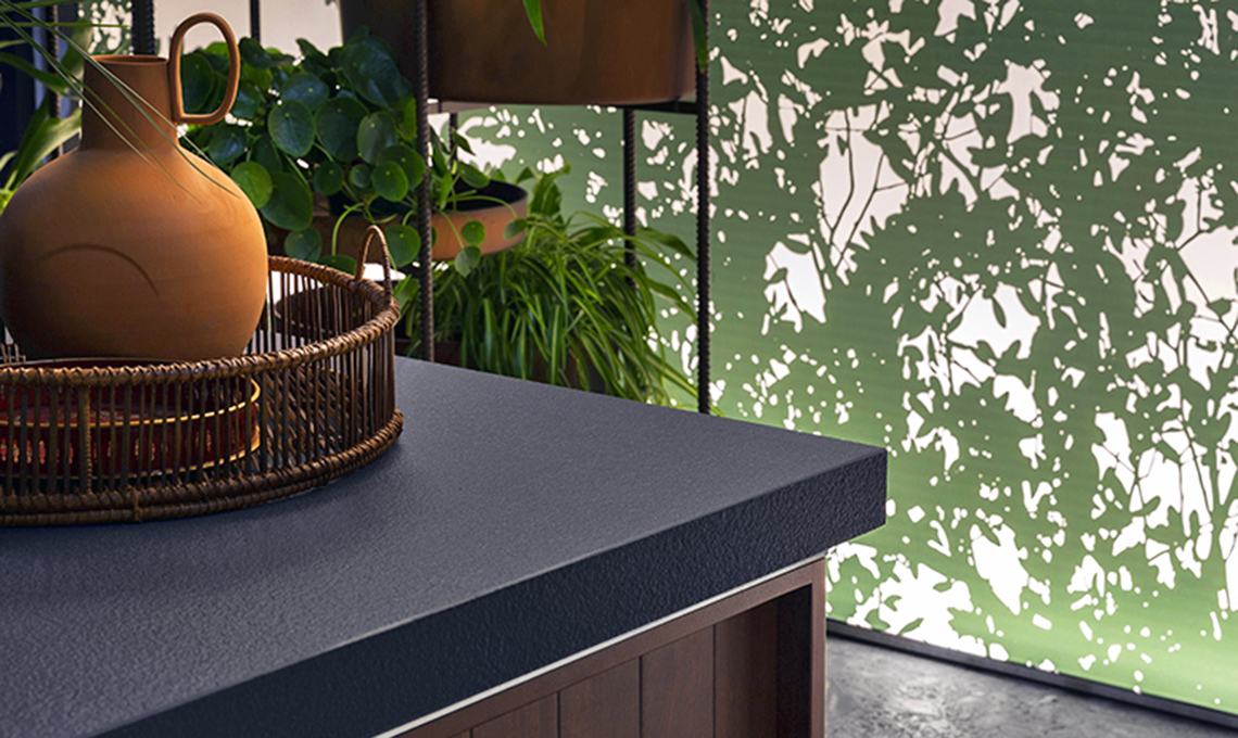 Lapitec®: miscela di minerali naturali sinterizzata e a tutta massa, per prestazioni top. Qui, in versione ‘goffrata’ nera [Lapitec®].