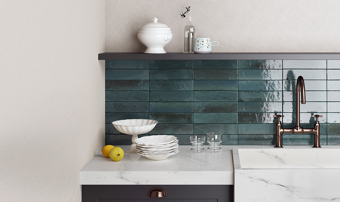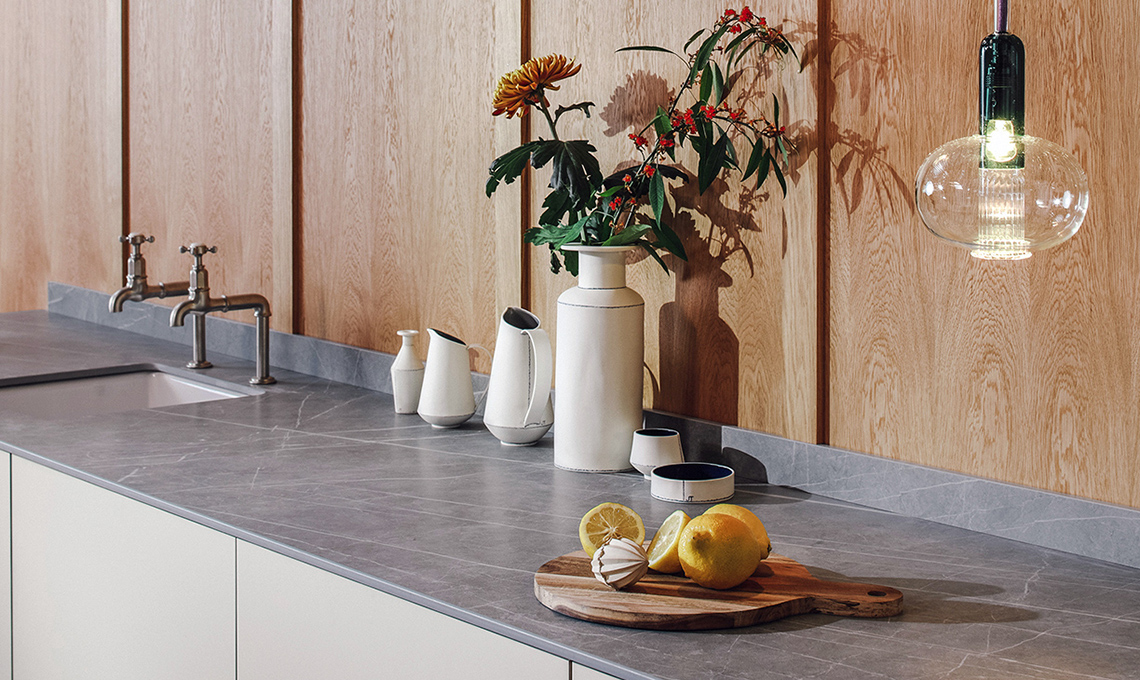 Grès: la serie The Top ha maxi lastre(cm160x320x0,6hecm162x324x 1,2h da tagliare a misura) in grès porcellanato per piani e paraspruzzi per un total look [Marazzi].