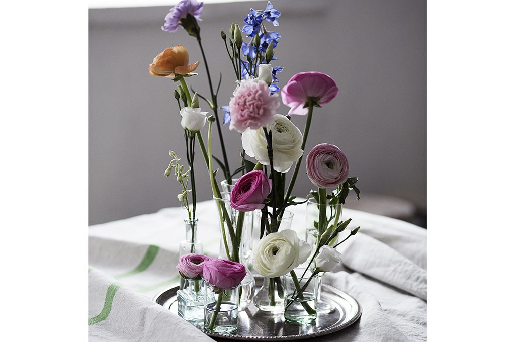 Un vassoio d'argento raccoglie i vasi sottili come fiale. In ognuno, un fiore di colore diverso