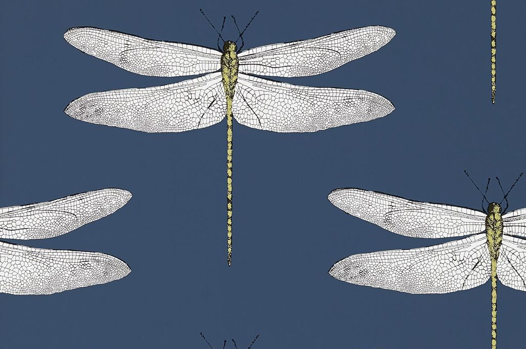 Sembra vista sotto una lente la libellula che decora la carta da parati Demoiselle [Harlequin, €104 al mt il rotolo da cm 53h].