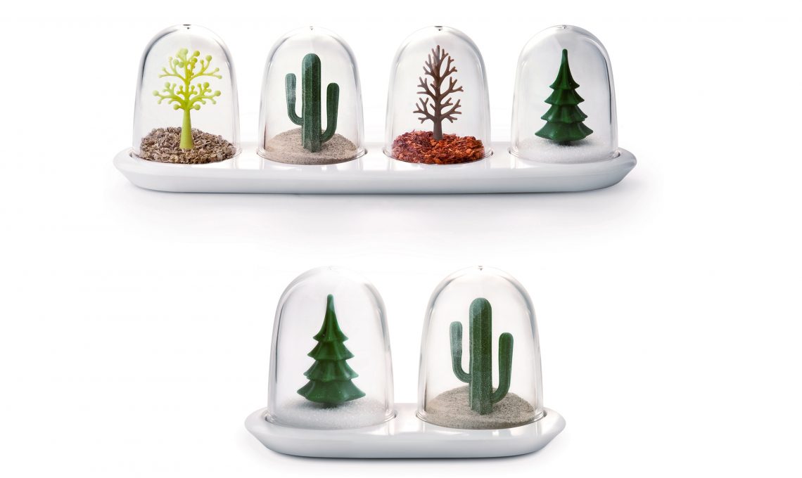 Un albero e una pianta grassa sotto le mini-teche. È il nuovo set sale e pepe da esibire in cucina [Maiuguali, cm 13x7x8h €27].
