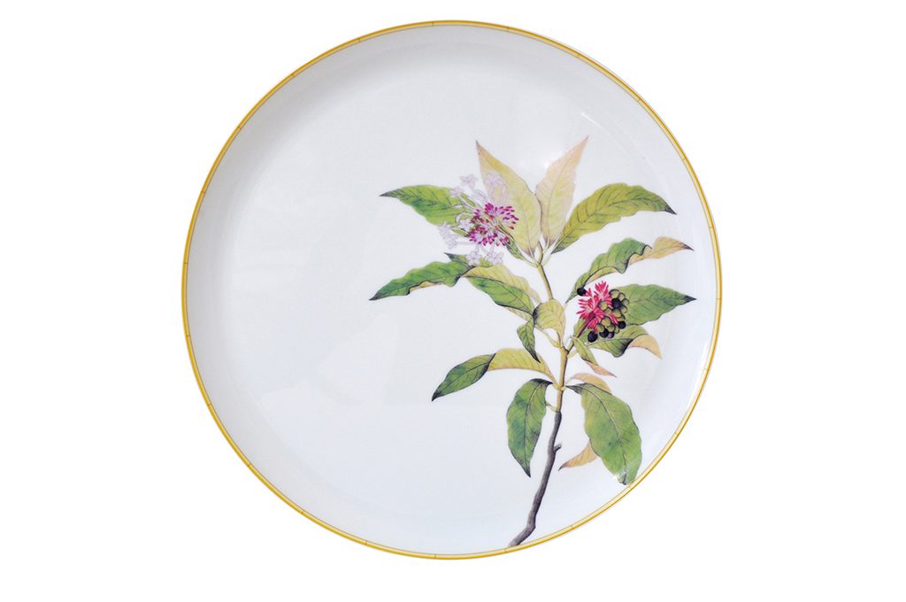 Atmosfere tropicali nel servizio in porcellana Jardin Indien [Bernardaud €250 il piatto torta].