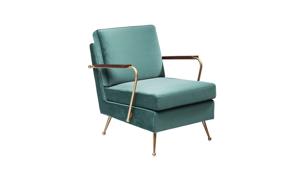 È rivestita in velluto la poltrona Gamble, con gambe e braccioli in ottone [Kare su » westwingnow.it, cm 55x81x72h €1.099].