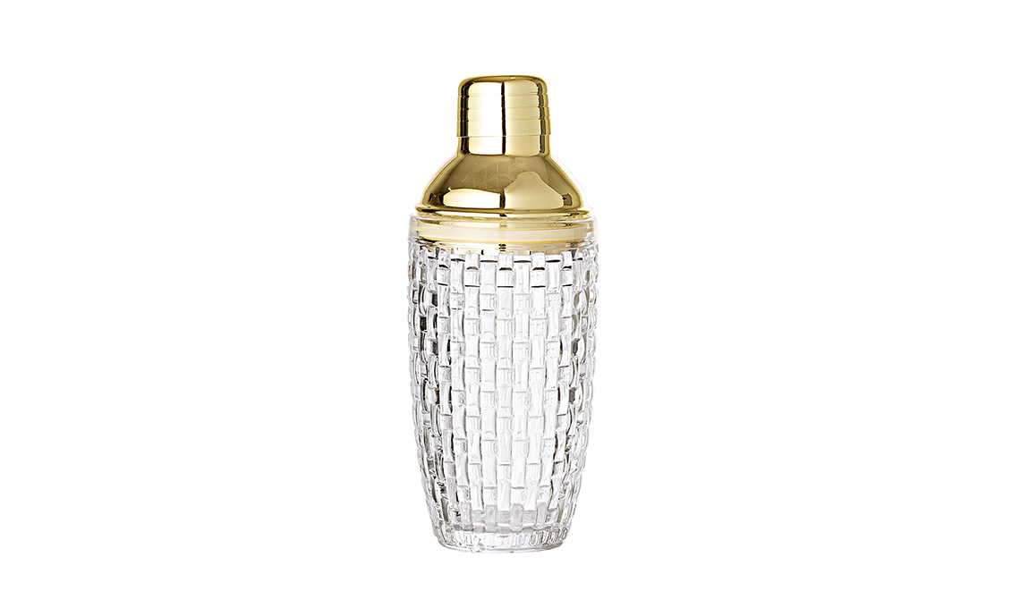 Shaker in vetro sfaccettato e tappo in inox dorato [Bloomingville, ø cm 8,5x22 €179].