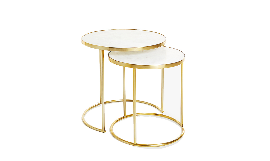 Cluster, set di due tavolini in metallo dorato con piano in marmo [Zara Home, ø cm 37x40h e ø cm 45x45h €199].