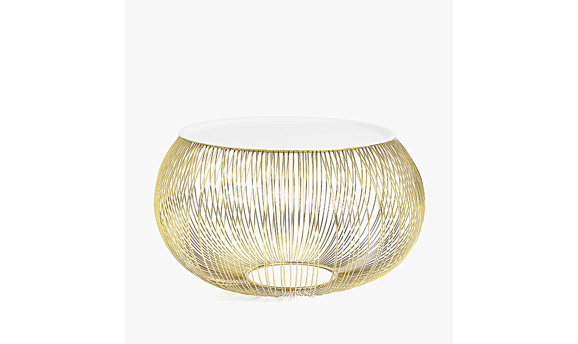Base in fili di ferro dorati e piano-vassoio per il tavolino [Zara Home, ø cm 70x38h €179].