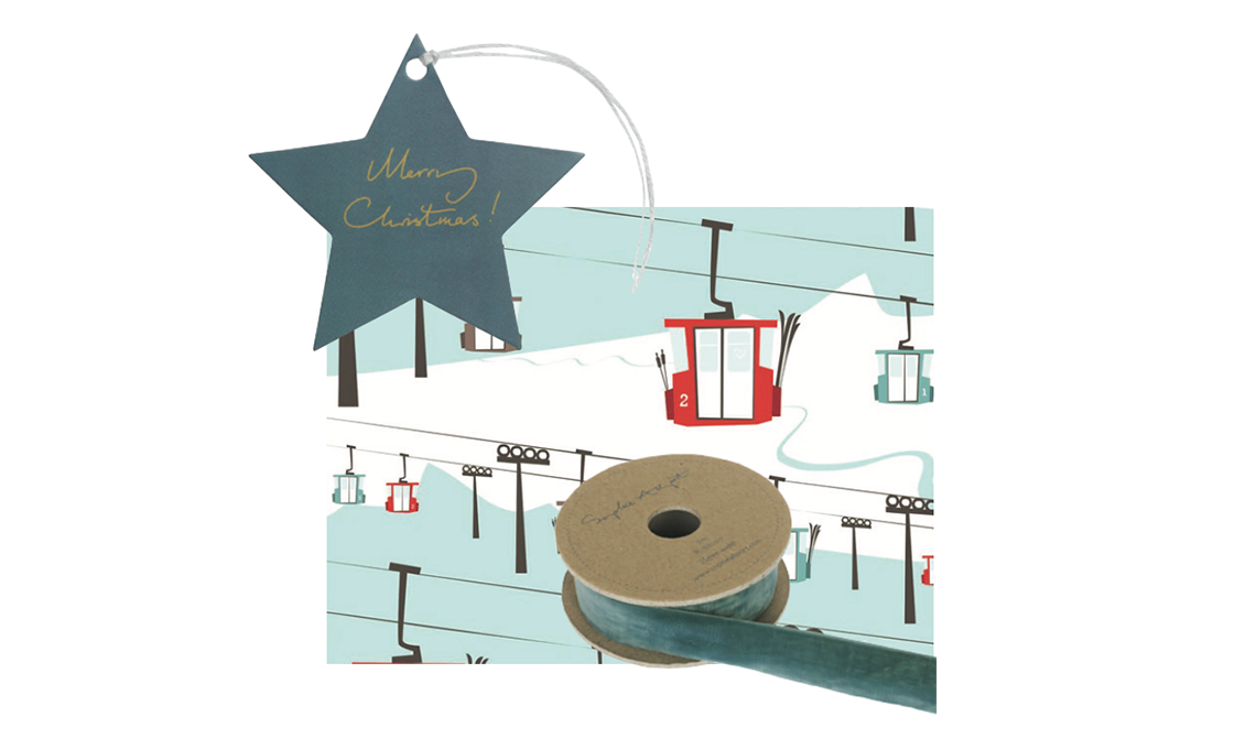 Carta con funivia [Pleased to Meet]. Chiudipacco stella e nastro di velluto [Sophie Allport].