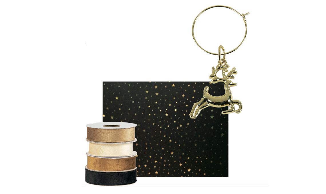 Carta con cielo stellato, nastri e segna bicchiere charm alce, da usare come chiudipacco [Casa].