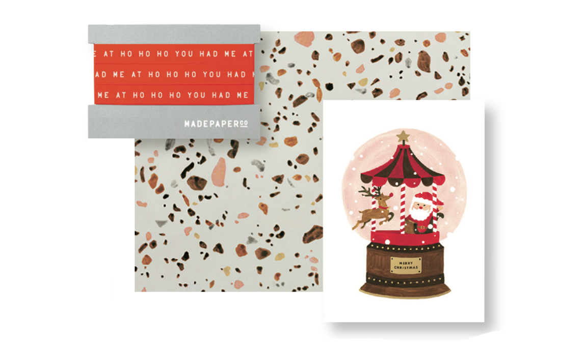 Carta effetto terrazzo e biglietto boule de neige [SayPaper]. Nastrino HoHoHo [Top Drawer].