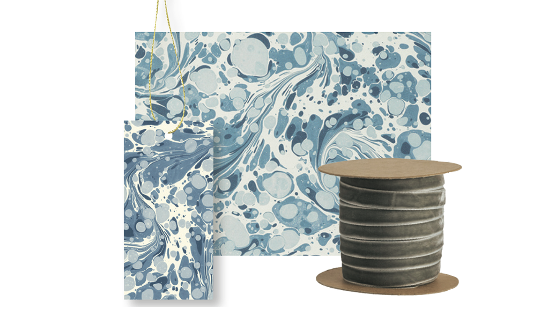 Effetto marmorizzato per carta e tag [Ferm Living]. Nastrino di velluto [Hudson Home].