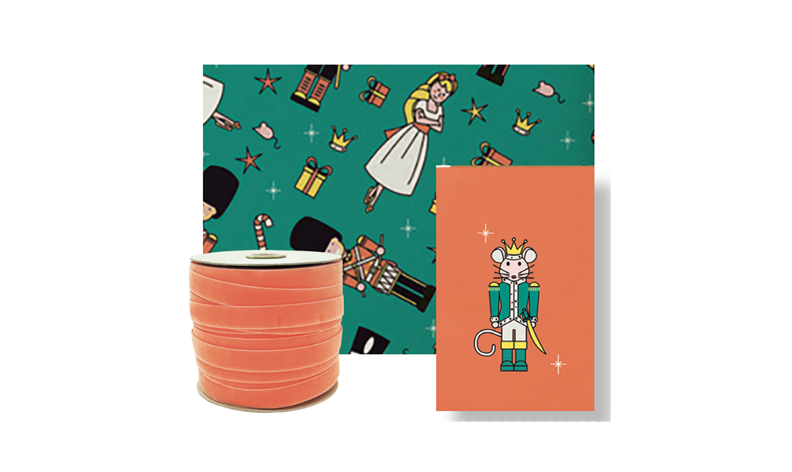 I topini e lo Schiaccianoci su carta e bigliettino [Storiographic]. Nastro di velluto corallo [Etsy].