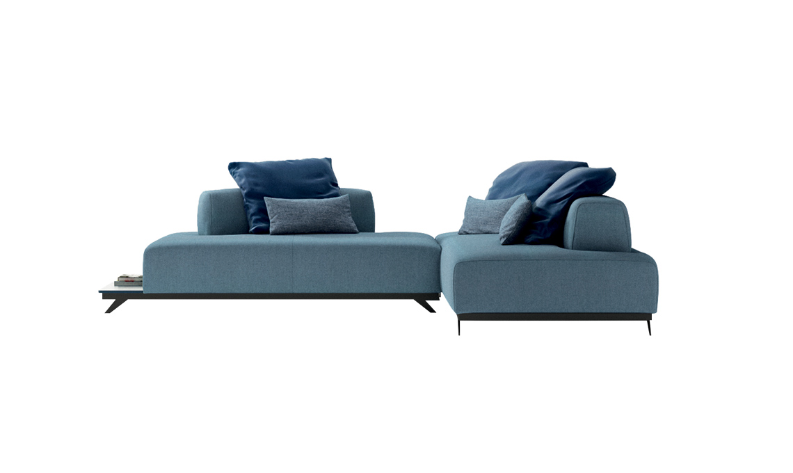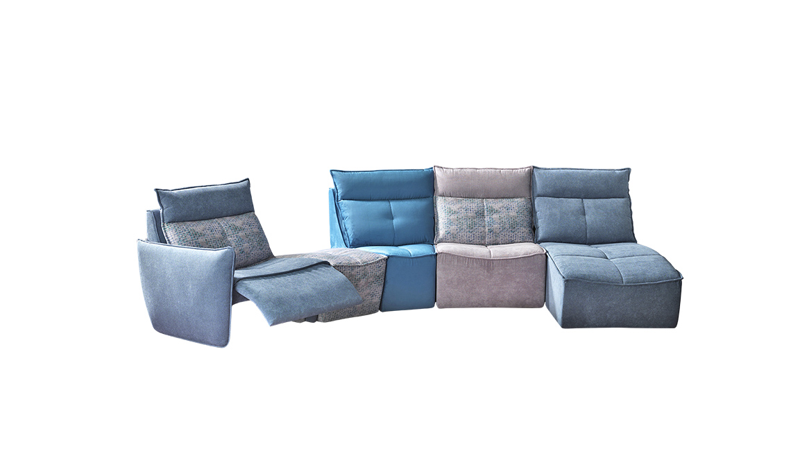 Rivestimento antimacchia e cuscini in tessuto idrorepellente. Newton ha lo schienale configurabile in base alle esigenze di chi lo utilizza [Doimo Salotti, cm 306x256 da €5.429].