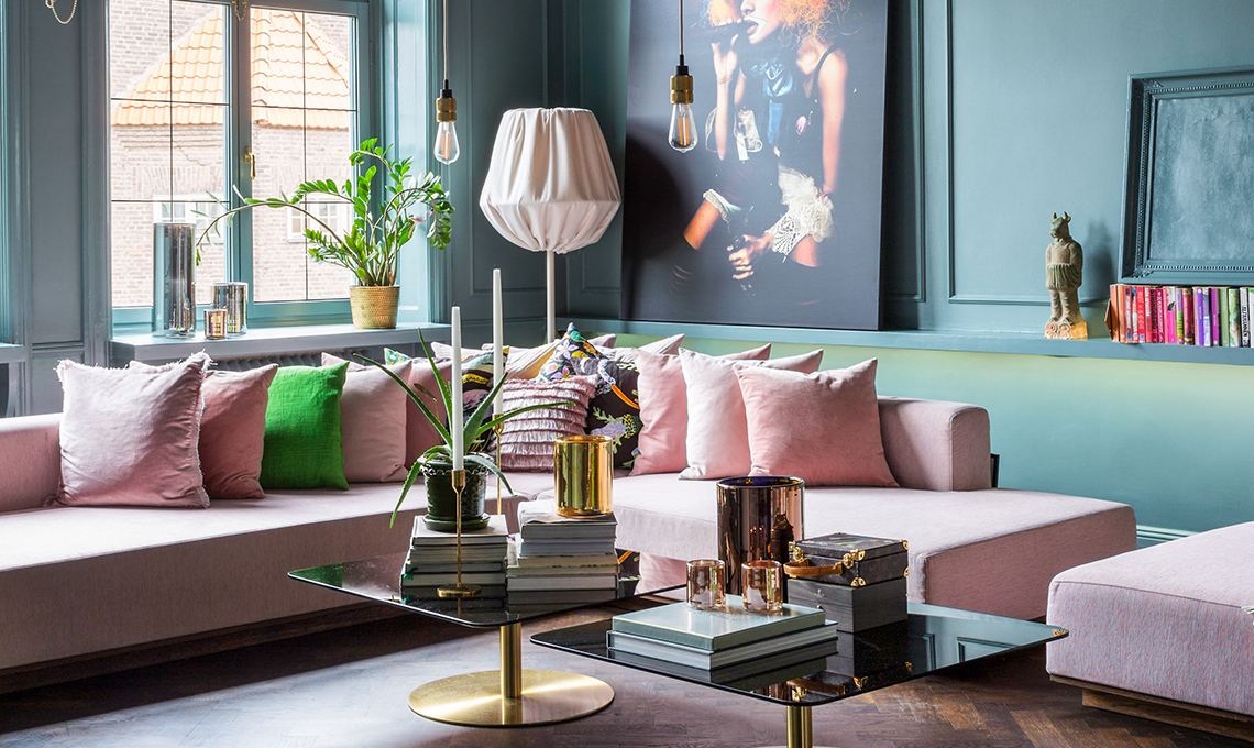 Divano simile al modello Nils [Ligne Roset], plaid [Hermès], coffee table Flash [Tom Dixon € 830], lampada da terra Baklava [Örsjö Belysning]. Quadro con clown acquistato al market The Old Biscuit Mill di Cape Town; quadro centrale proveniente dalla galleria di [Maria Wettergren].