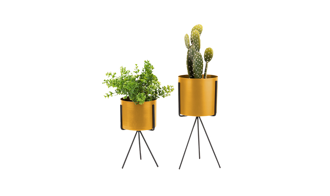 Su piedistallo in ferro le fioriere con vaso in metallo oro [Red Candy, €29 la coppia].