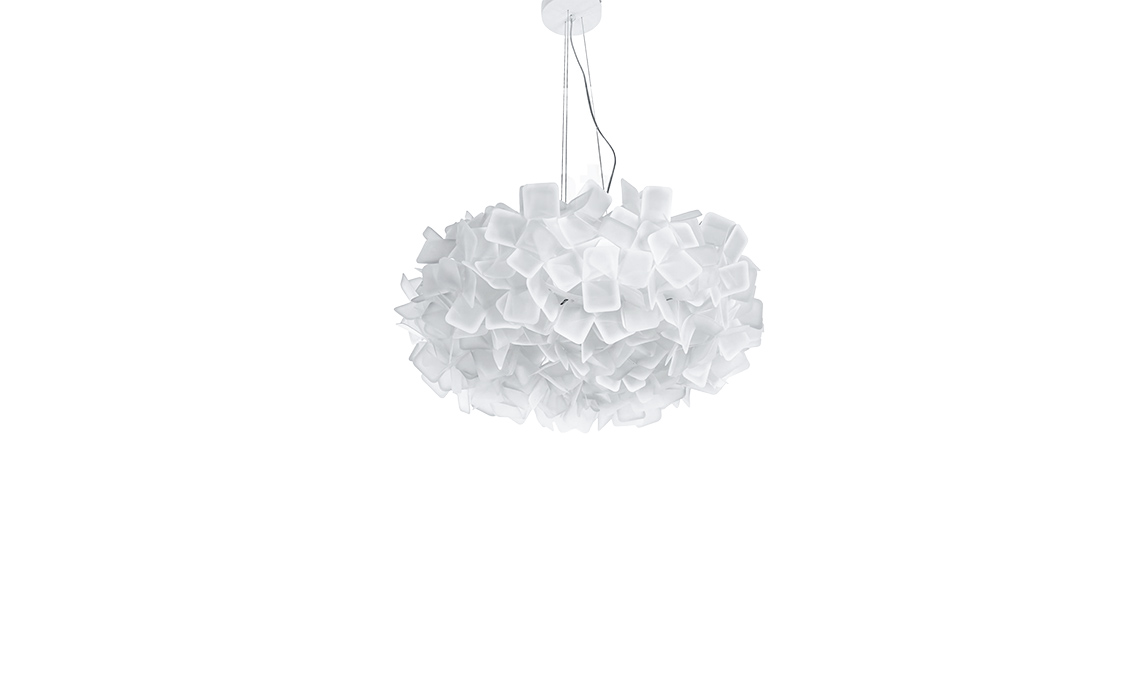 Trasparenze e riflessi nella sospensione Clizia, design Adriano Rachele [Slamp, da ø 53x25h € 255].