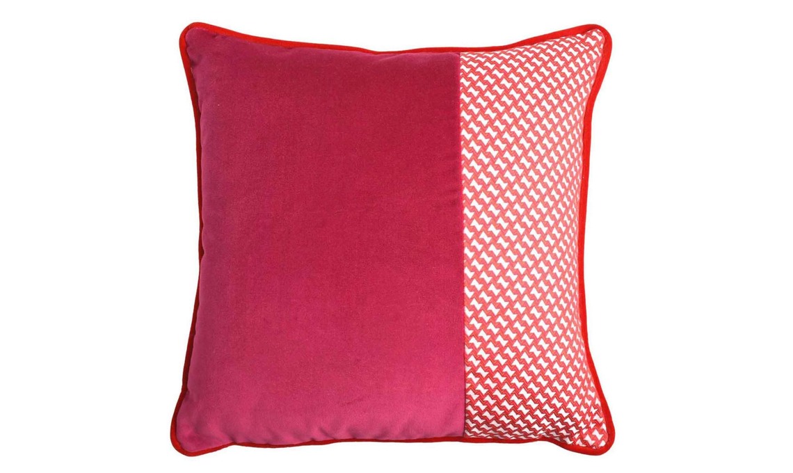 Cuscino Carrè Stripe realizzato in un sofisticato tessuto jacquard a piccolo disegno abbinato al velluto di cotone in fucsia earancio [L’Opificio, da cm 43x43].