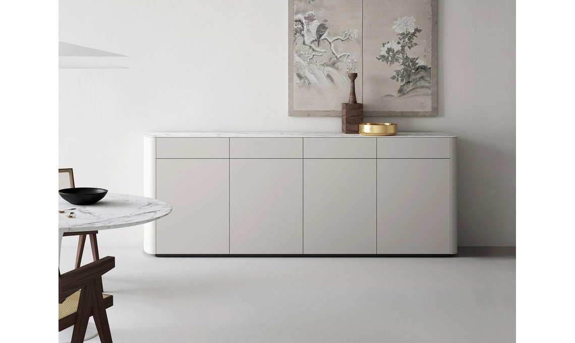Nadia Side, qui in laccato opaco rugiada Kera Invisible White: è formata da moduli base Wallover abbinati a fianchi stondati ‘a parentesi’