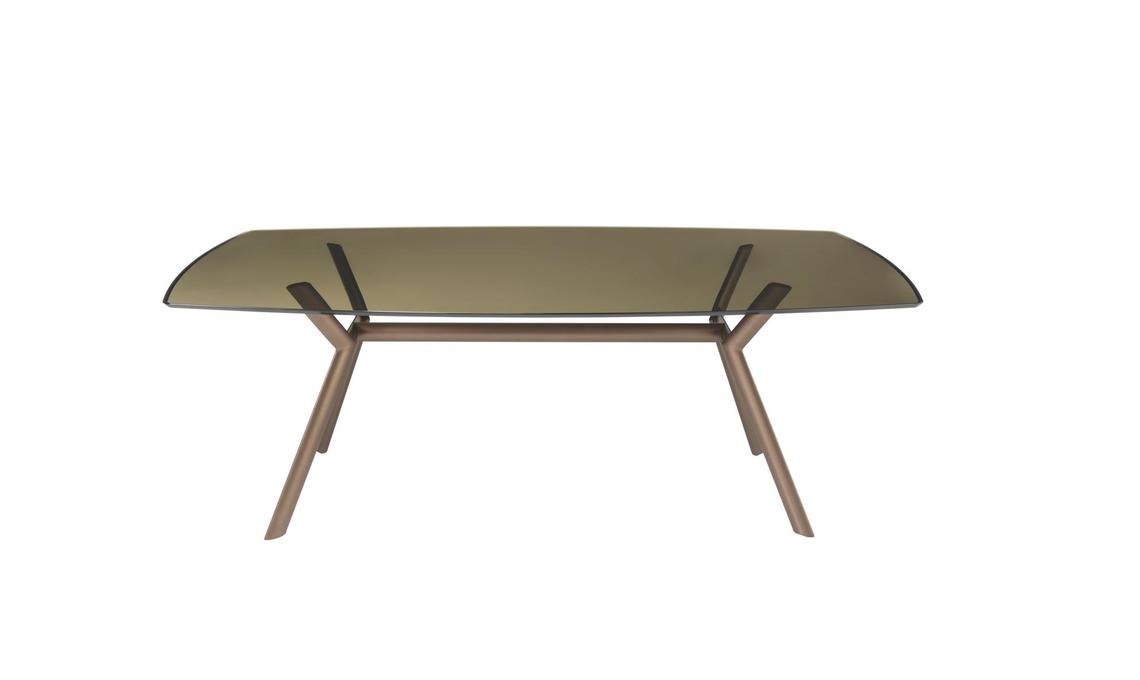 Tavolo Paradise in alluminio bronzo con top in cristallo trasparente bronzato [Riflessi, cm 220x110x 76h].