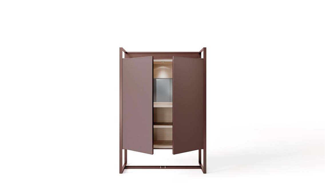Mobile bar Rialto con struttura in alluminio e top in vetro amaranto opaco, ante