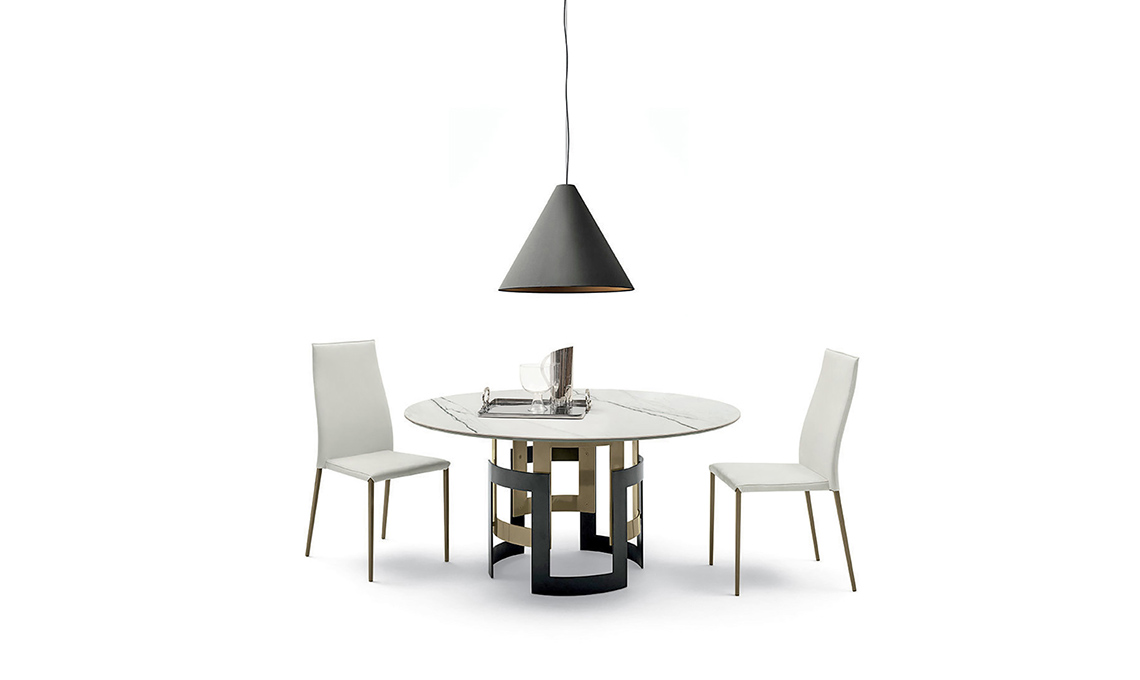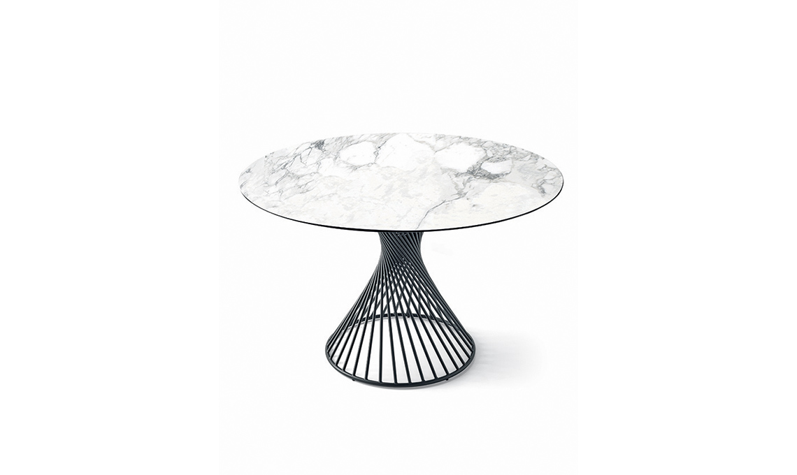 Imperial: base ‘a bracciale’ in acciaio laccato e piano in marmo [Bontempi Casa, ø cm 150x75h € 2.780].