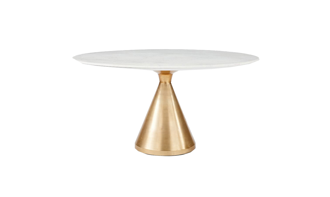 Silhouette ha base in metallo finitura ottone e piano in marmo [West Elm, ø cm 152x76h € 1.400].