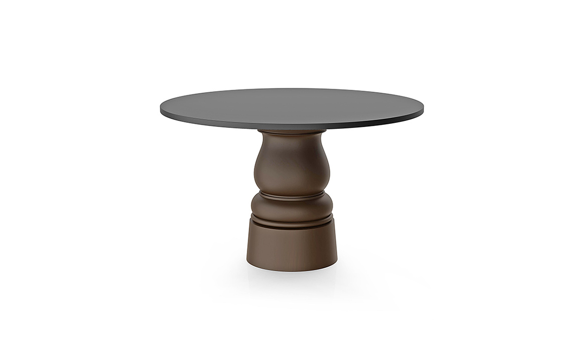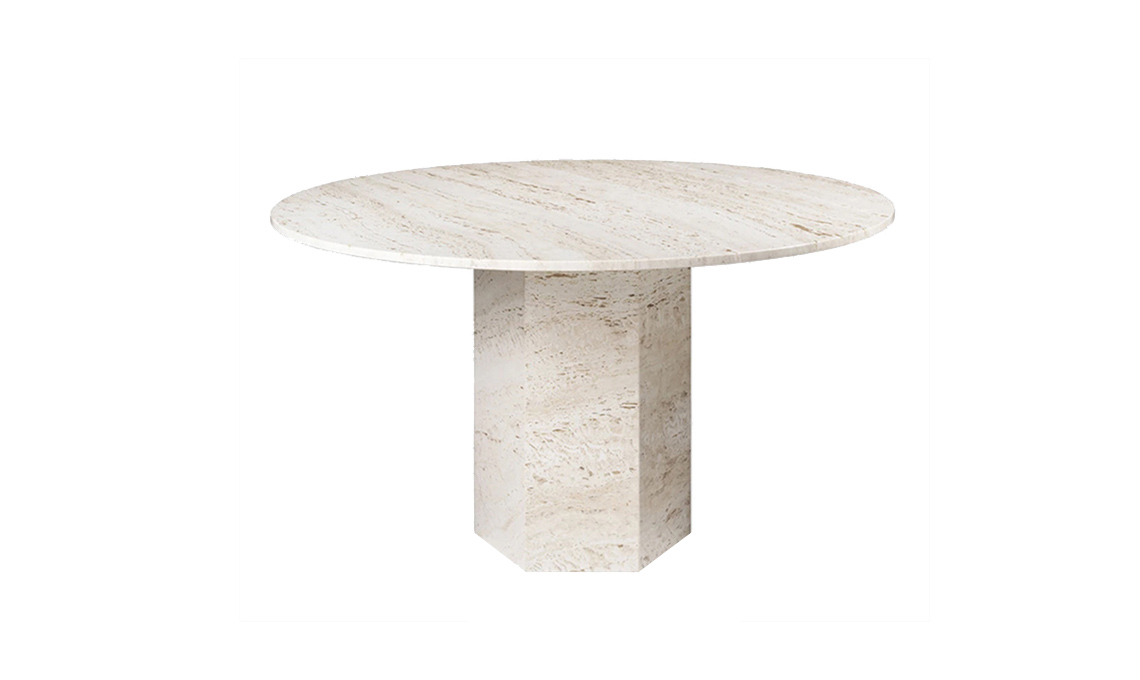 Ispirazione neoclassica per Epic, in travertino con base a colonna [Gubi, ø cm 130x74h € 4.000].