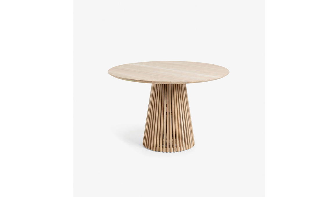 Jeanette, in legno massello di teak naturale con base fatta a listelli [Kave Home, ø cm 120x78h € 619].