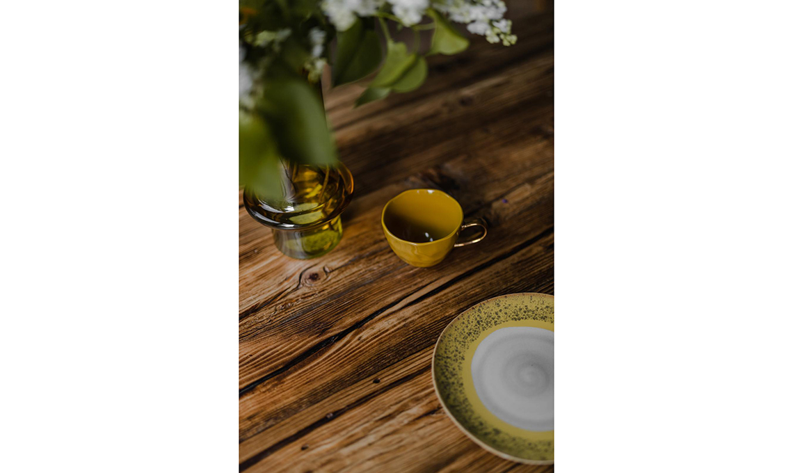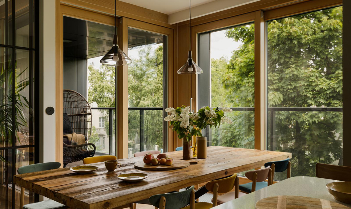 Il tavolo rustico, il parquet, gli infissi, la boiserie: l’essenza scura di quest’ultima si contrappone a quella più chiara dei primi tre e dei colori dei complementi. E dà un tocco di calore!