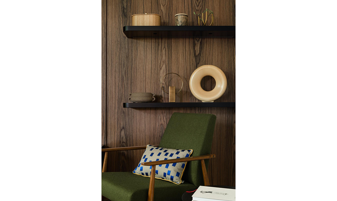 Sospensioni [Ardant], poltrona simile a Ekenaset [Ikea], cuscino Doris [HK Living], appendiabiti come Dots [Muuto].