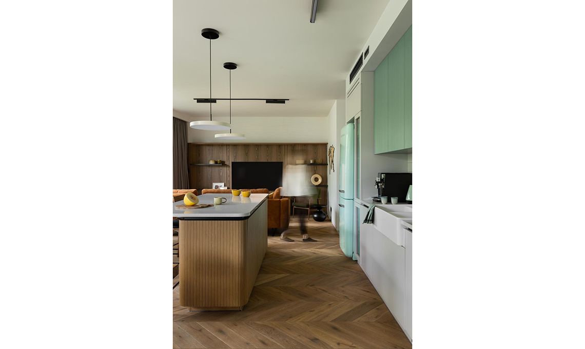 Sospensioni sull’isola Asteria [Umage Design], barre luminose [Labra Lighting], lavello [Villeroy&Boch], frigorifero 50’s Style [Smeg], piastrelle 10x10 simili le trovi nella collezione Confetto bianco [Marazzi].