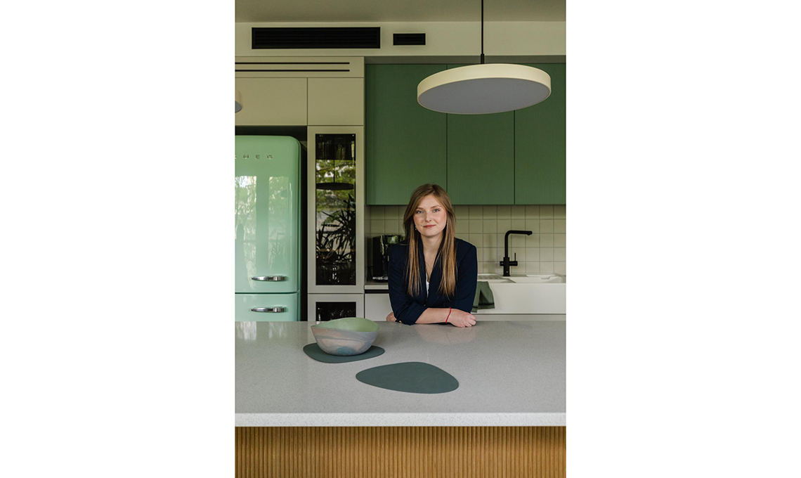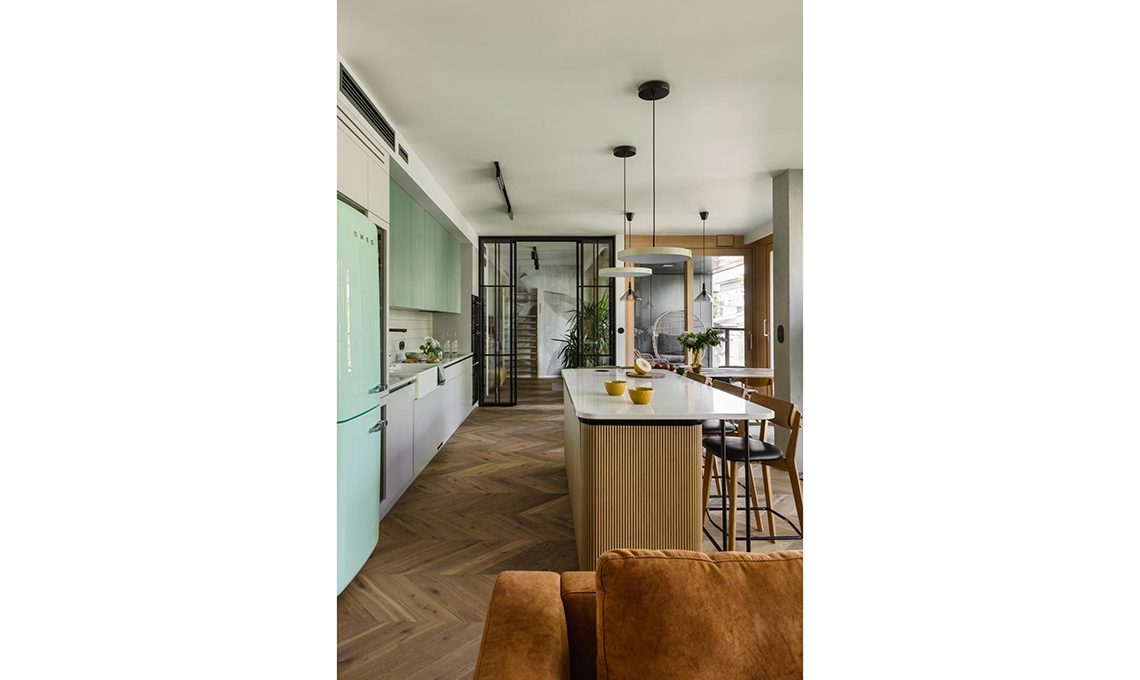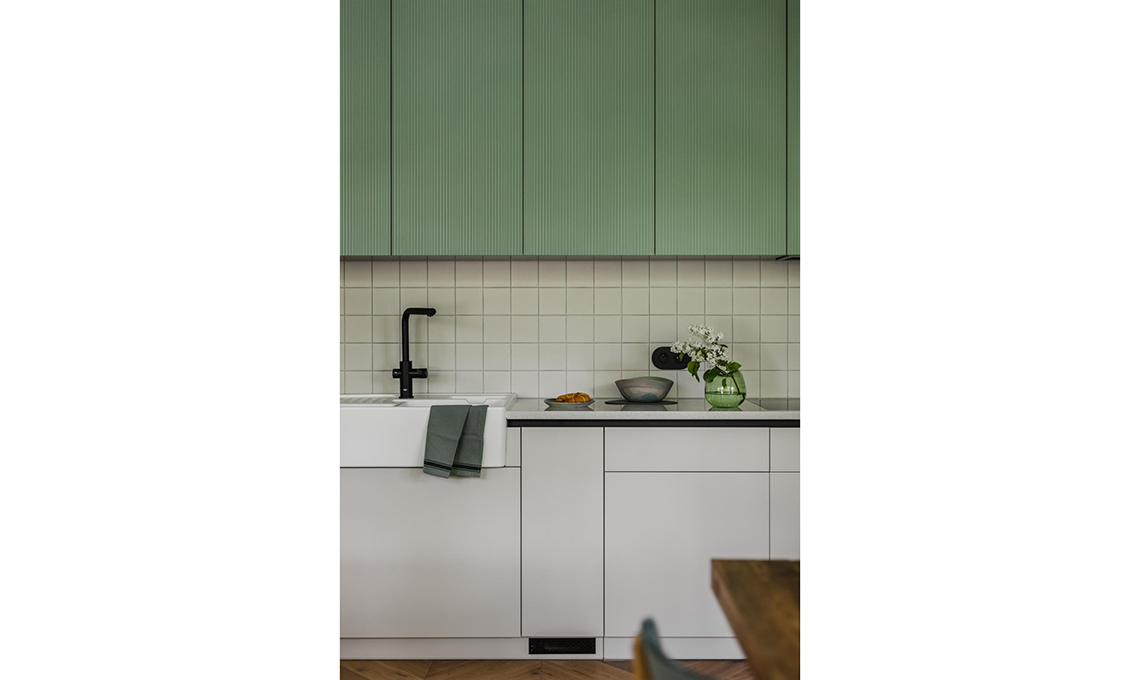 Richiami rétro in una cucina moderna: piastrelline 10x10, lavello in ceramica e frigorifero Fifties di un verde iconico!