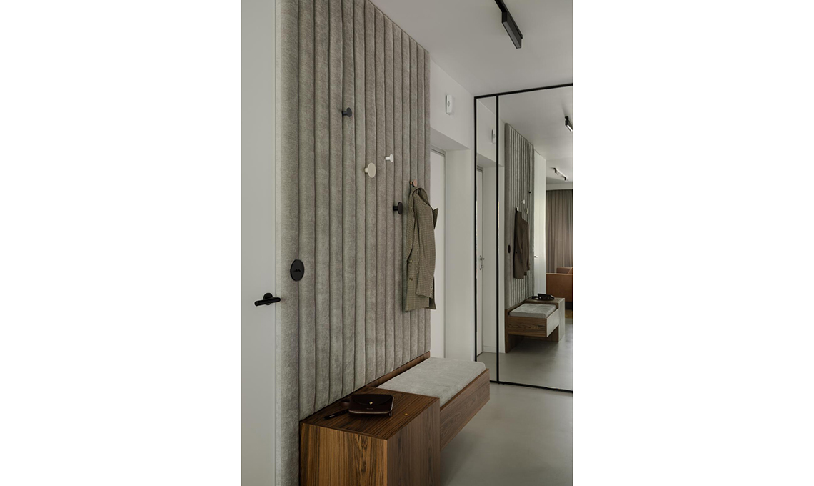 Un pannello di rivestimento imbottito (a destra) fa da sfondo ad alcuni appendiabiti, a una panca sospesa e al cestone estraibile per riporre le scarpe. Scelta intelligente, decorativa e pratica perché sottolinea la zona dell’ingresso e protegge il muro. Per un pannello imbottito e foderato, da fissare direttamente a parete, rivolgiti al tappezziere.