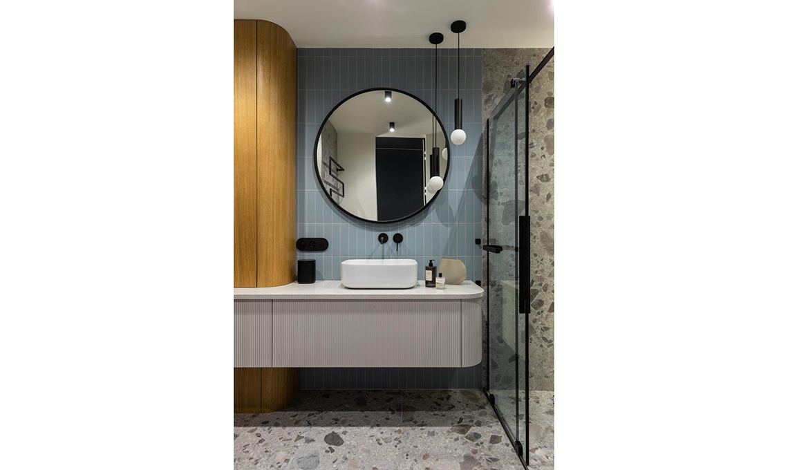 Il bagno gioca nei colori dell'azzurro povere a contrasto con i toni caldi del legno.