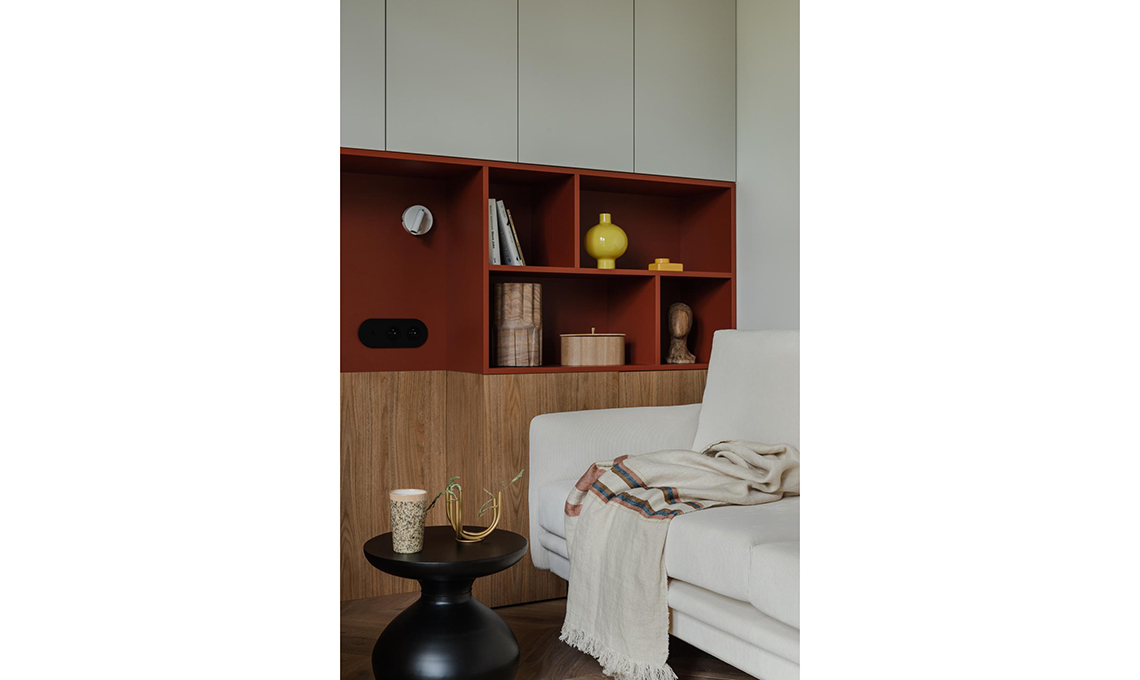 Anche le mensole sulla boiserie riprendono il dettaglio curvo dell’isola. Gli oggetti? Natural style!