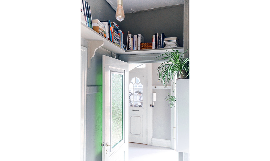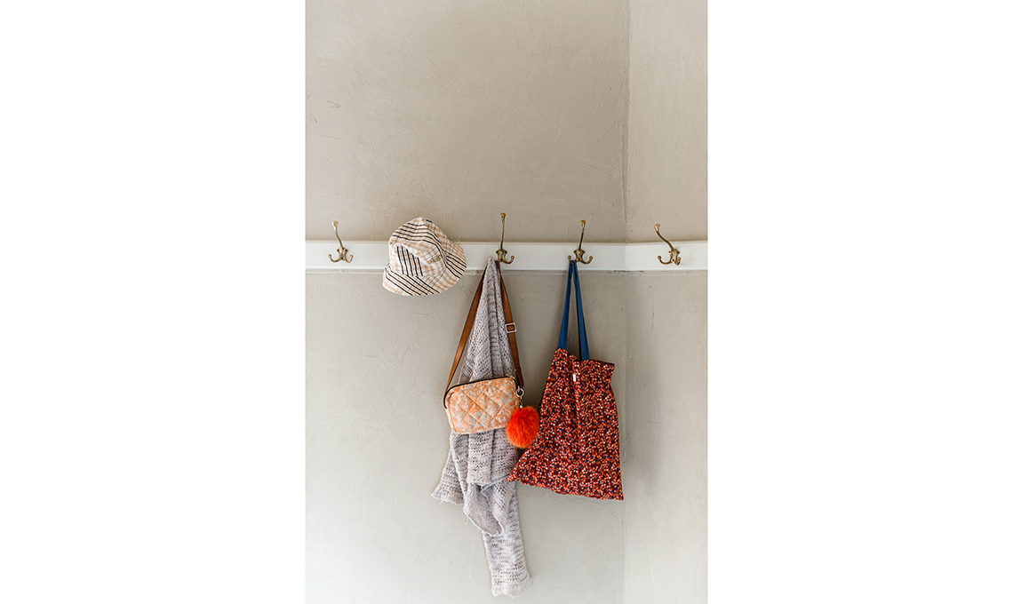Sfrutta le altezze: il doppio mensolone a correre fissato sulla parete dell’ingresso, sopra gli stipiti delle porte. Mads l’ha disegnato su misura, fatto tagliare