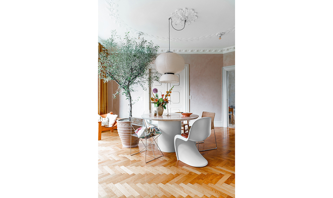 Nella cornice classica del soffitto modanato, il tavolo di marmo con colonna, dal design ultramoderno, crea un’isola con le sedie spaiate. Sfrutta le altezze la pianta di ulivo a centro stanza.