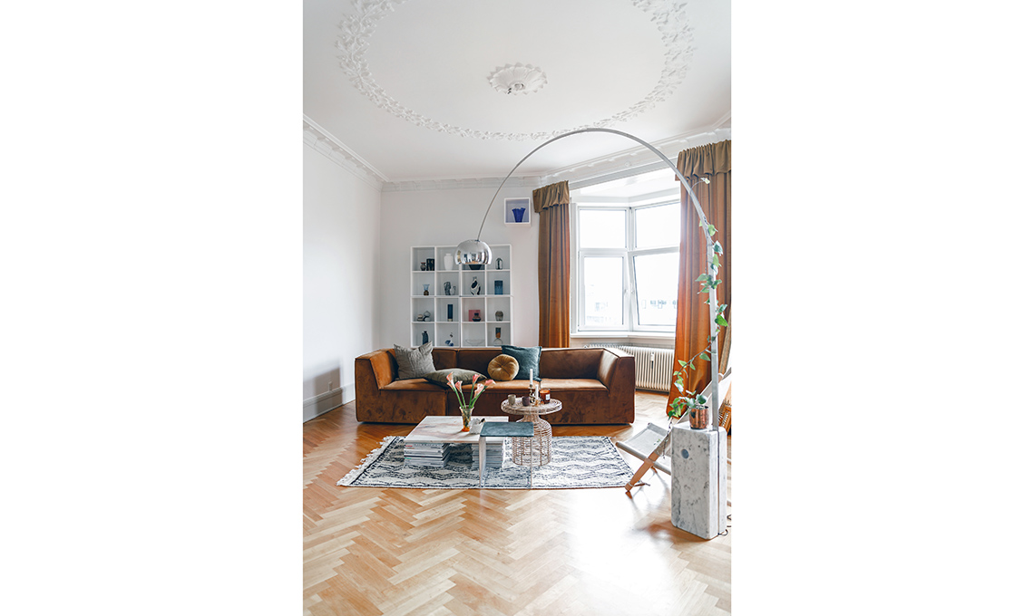 divano [Sofacompany], tende in velluto [Jotex], lampada da terra Arco disegnata nel 1962 dai fratelli Castiglioni [Flos], tappeto [Carpet Diemer].