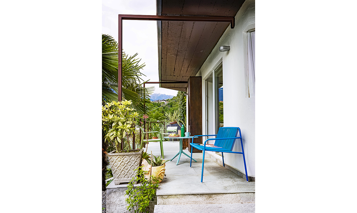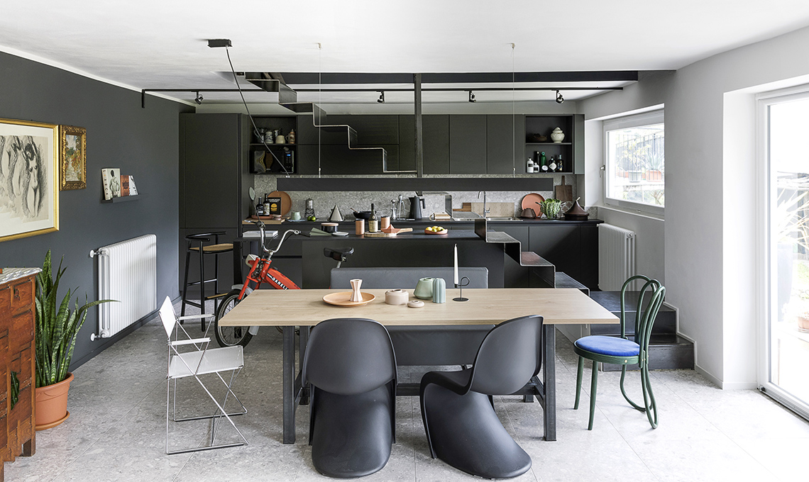 Attorno al tavolo realizzato su disegno: coppia di sedute Panton Chair [Vitra]. Sedia Post Mundus design Martino Gamper [Gebrüder Thonet Vienna], sedia vintage Xline 90 [Magis].