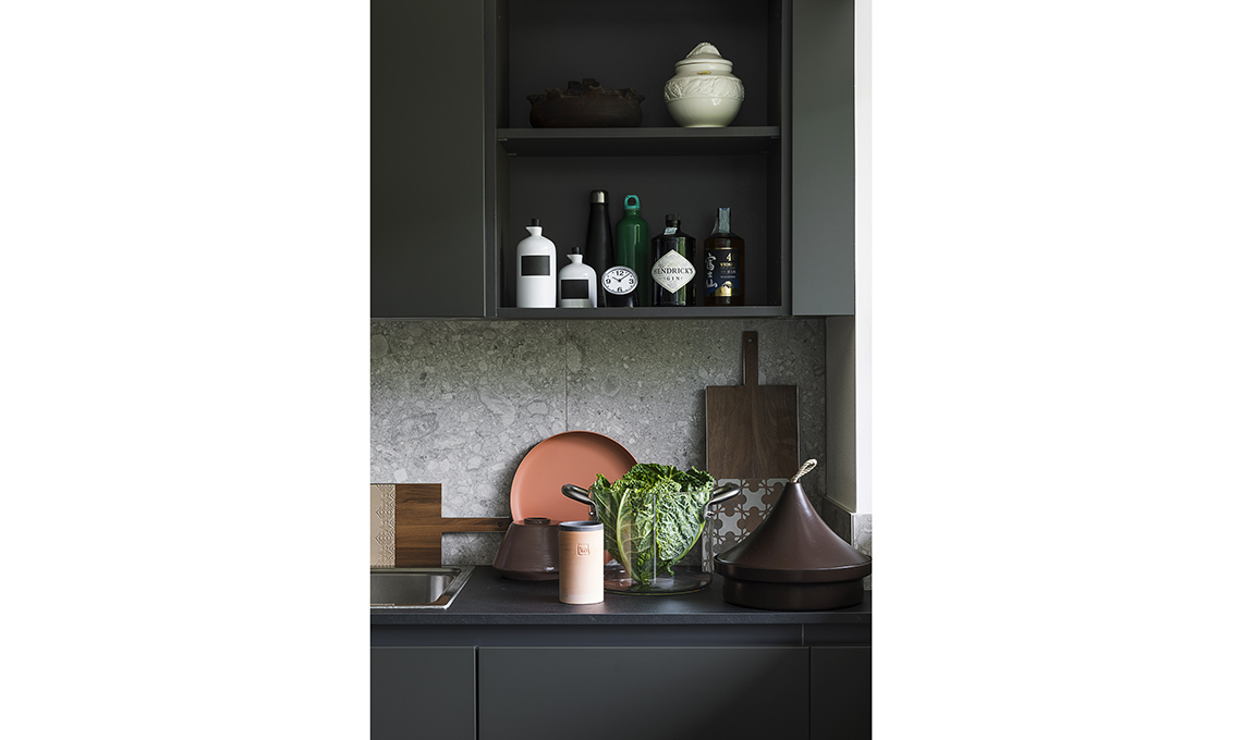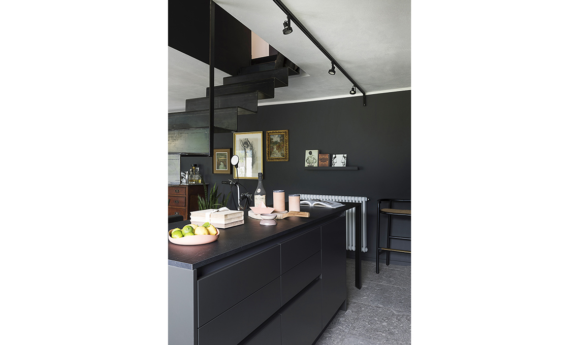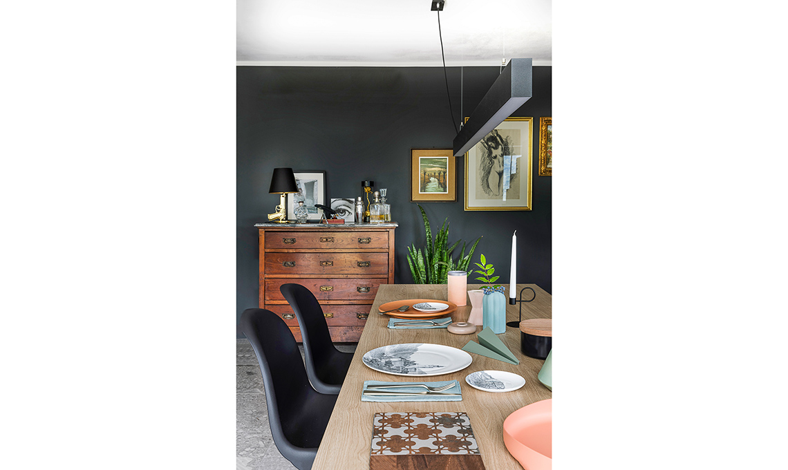 In uno spazio luminoso, la parete scura è il fondale perfetto per creare una home gallery: quadri, libri e stampe diventano protagonisti.