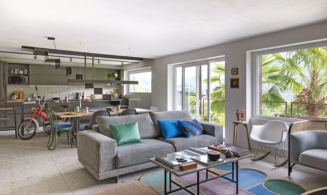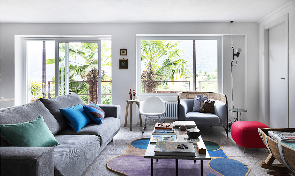 Sul divano: cuscini [HKliving da Nap Atelier]. Tappeto Rotazioni B [cc-tapis]. Poltrona Eames Plastic Armchair [Vitra, cm 52x81x76h, € 550].